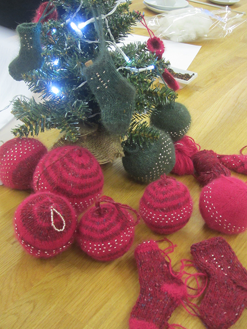 These beautiful knitted Christmas bauble and mini stocking hanging decorations from the workshop with Bev - so cute!