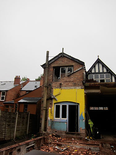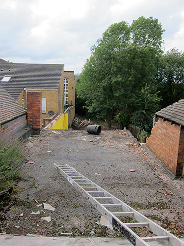 Now it looks like this....with the flat roof gone and most of the wing taken down. All the best bricks were saved too to rebuild the gable ends and build the courtyard walls.