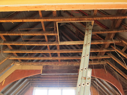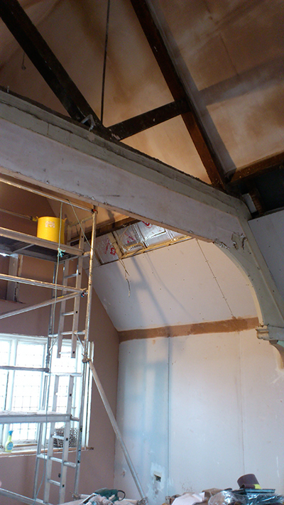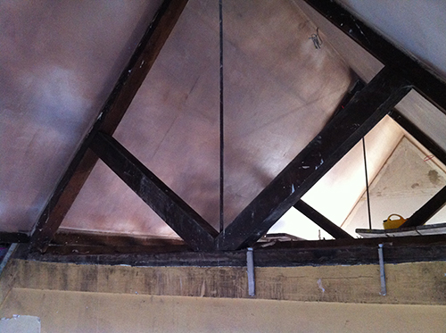 ...and now its all been plastered and the horizontal beams you can see in the pictures above have been removed. The big A-frames are looking great. We just need to strip the old paint from the lower section of them. Plan is to leave them as exposed wood.